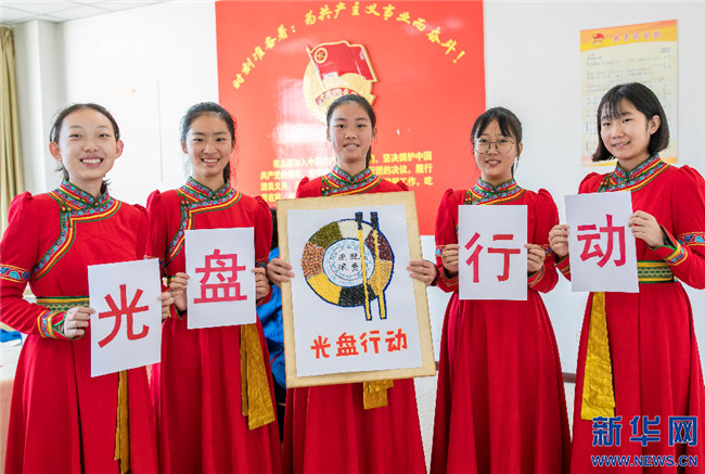 15日,內蒙古呼和浩特市第二十六中學學生展示“光盤行動”趣味糧食貼畫。新華網(wǎng)發(fā)(丁根厚攝)