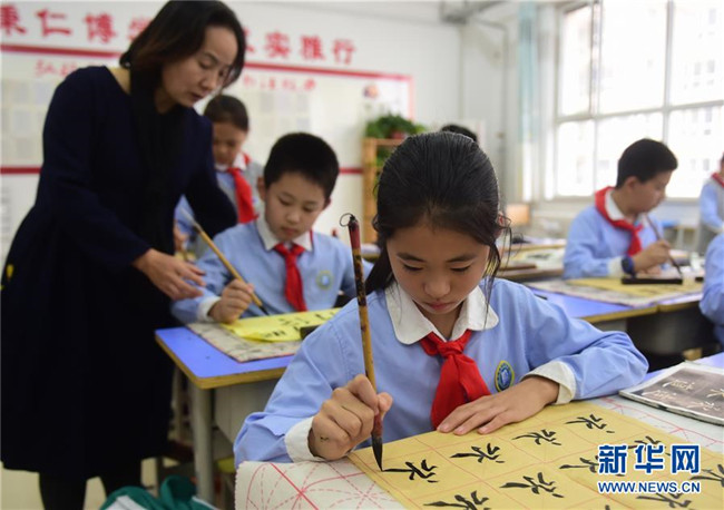 10月20日,滄州市實(shí)驗(yàn)小學(xué)參加“校內(nèi)課后延時(shí)服務(wù)”的學(xué)生在老師的指導(dǎo)下練習(xí)書法。
