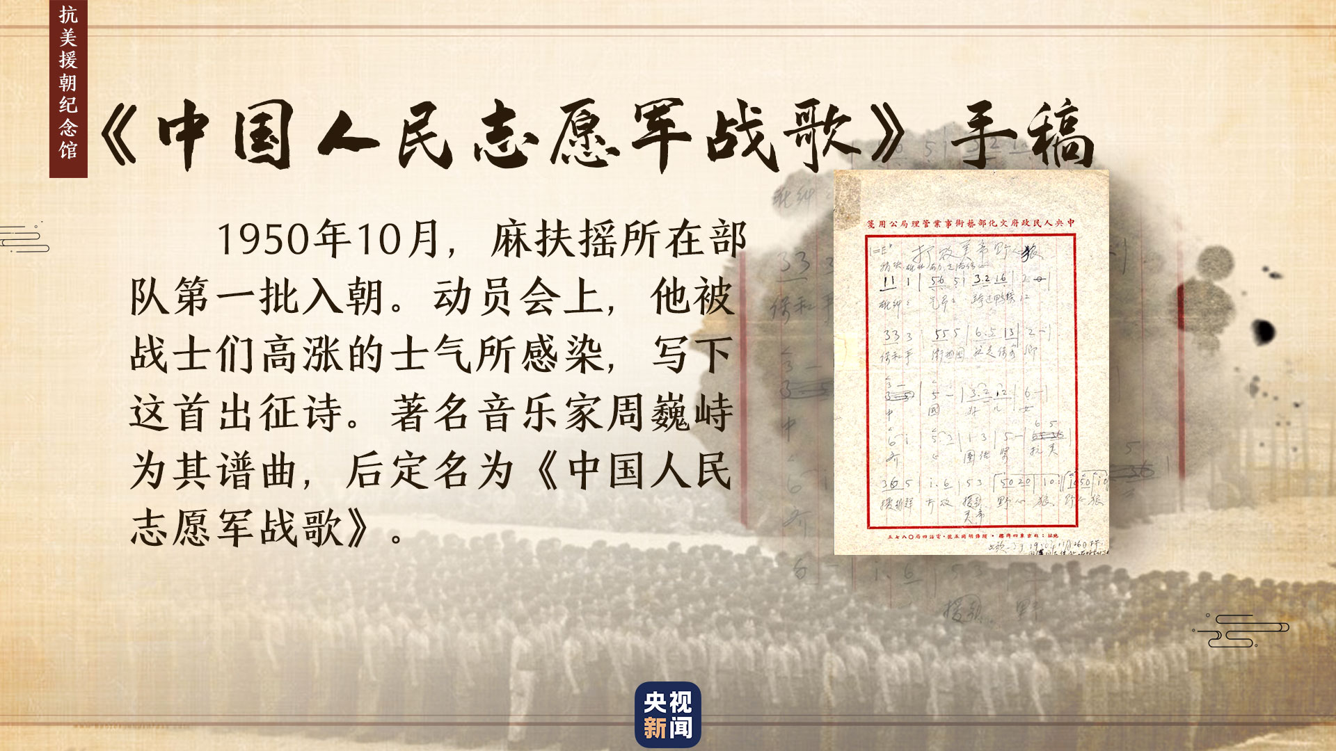 在此期間,有的刊物以《中國人民志愿軍部隊?wèi)?zhàn)歌》為題,轉(zhuǎn)發(fā)這首詩。周巍峙覺得很好,就將歌名定為《中國人民志愿軍戰(zhàn)歌》。