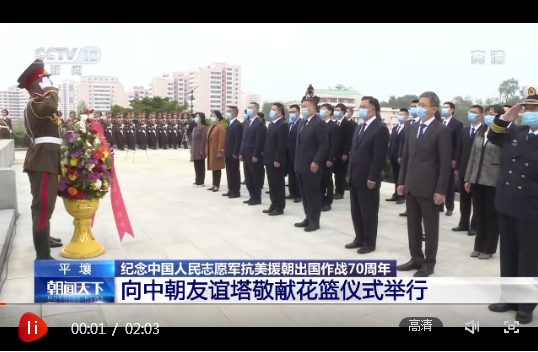當(dāng)?shù)貢r間21日,以中共中央總書記、國家主席、中央軍委主席習(xí)近平名義向朝鮮平壤中朝友誼塔、檜倉中國人民志愿軍烈士陵園敬獻花籃儀式在朝鮮舉行。中國駐朝鮮大使率全體館員及其他在朝中方人員代表出席。