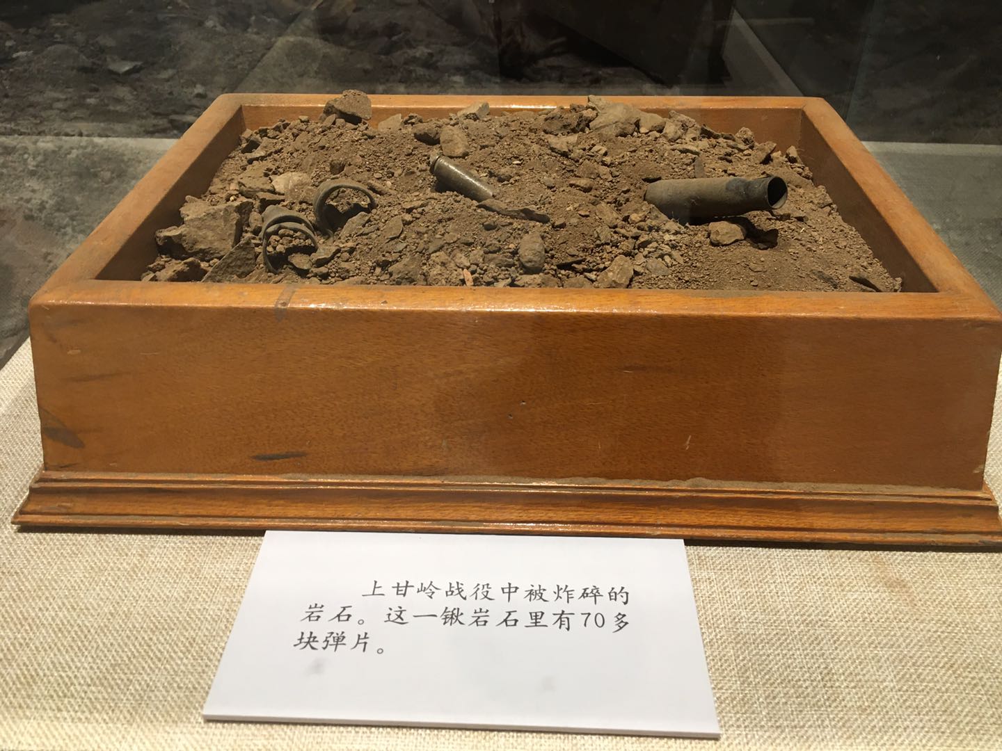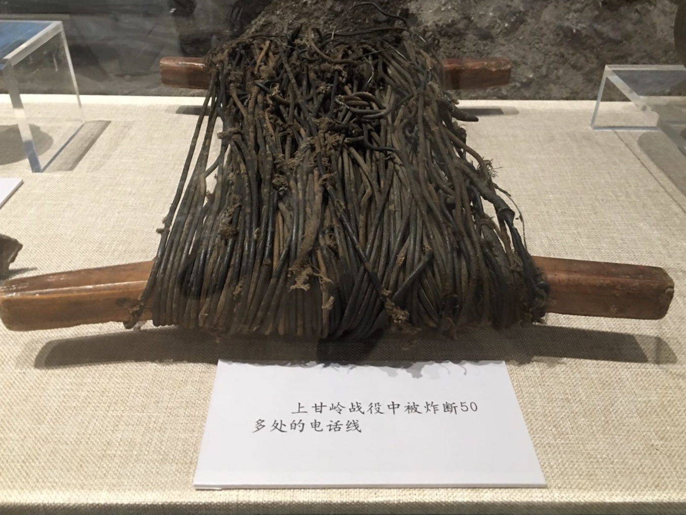 在軍博的主題展覽“血戰(zhàn)上甘嶺”展區(qū),幾件戰(zhàn)場實(shí)物似乎還能讓人聞到當(dāng)年的殘酷硝煙:一截嵌滿彈片的枯樹干,一堆摻雜著彈片的碎石焦土,被炸斷50多處的200多米電話線……
