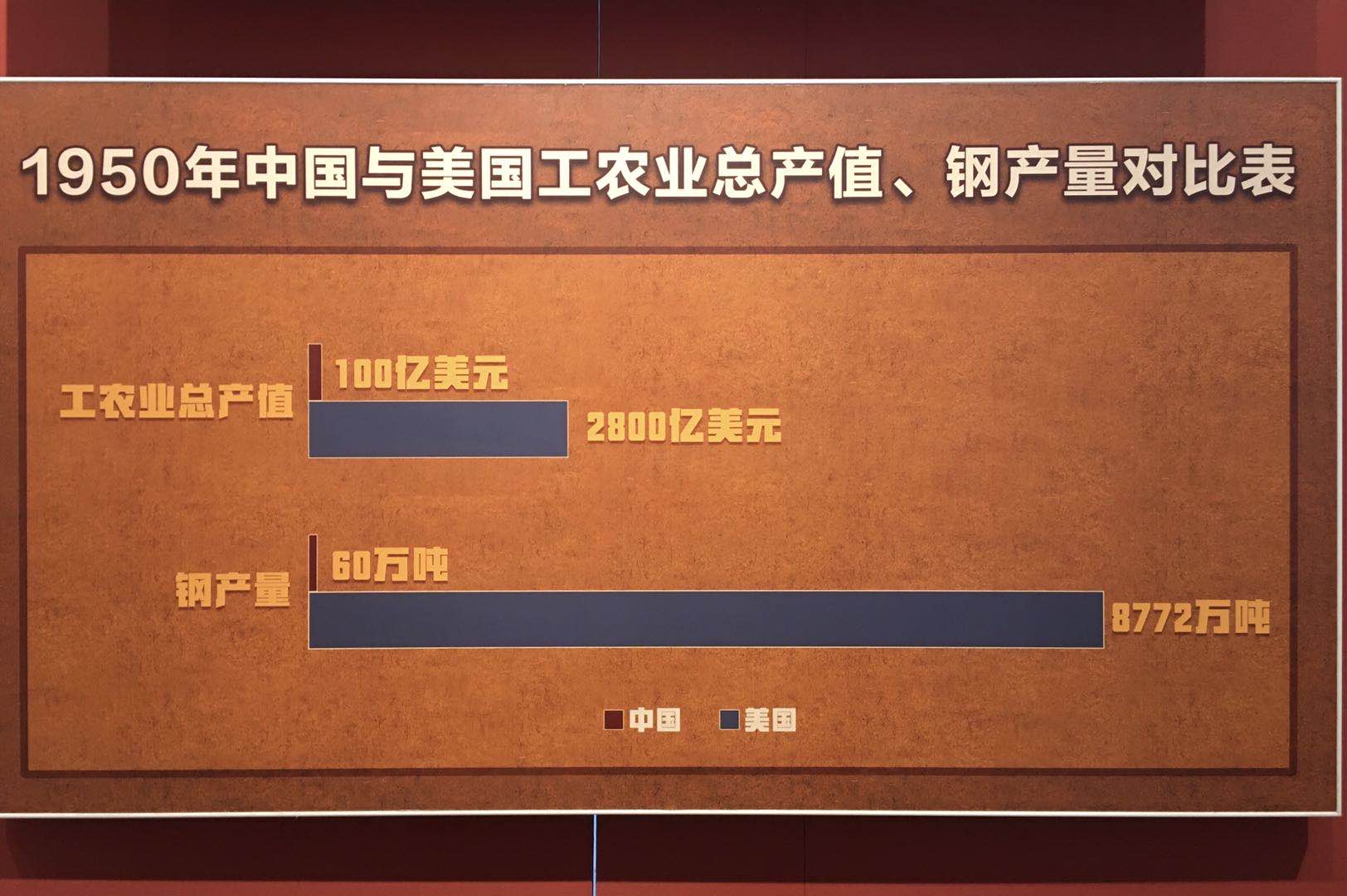 展廳里,一張對(duì)比圖,直觀展現(xiàn)了當(dāng)時(shí)中美兩國在硬實(shí)力方面的巨大差距。
