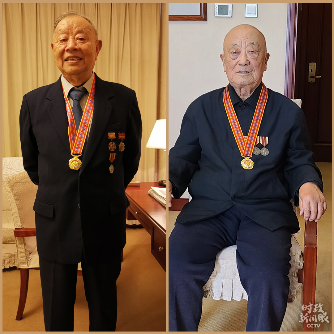 △今年86歲的張?jiān)埽ㄗ螅﹨⒓舆^上甘嶺戰(zhàn)役,榮獲三等功2次,90歲的王德啟(右)在抗美援朝期間榮立三等功4次。他們都出席了當(dāng)天的紀(jì)念大會。(總臺央視記者王曉東、趙化拍攝)