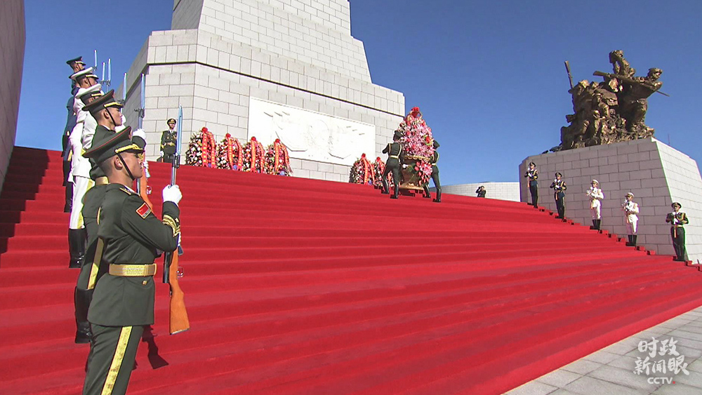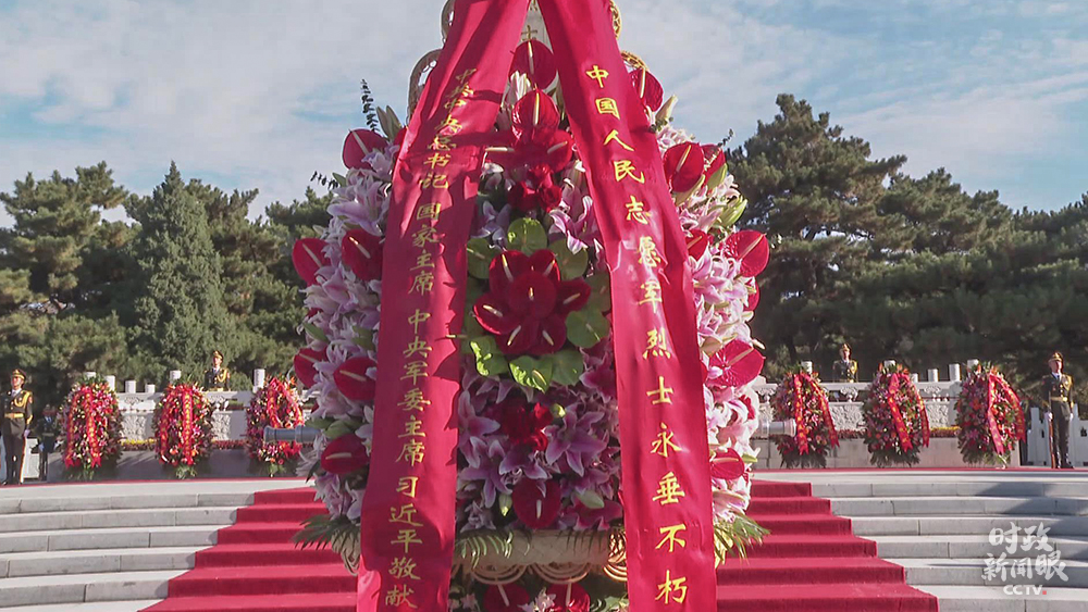 △遼寧沈陽抗美援朝烈士陵園,以習(xí)近平名義敬獻(xiàn)的花籃擺放在烈士紀(jì)念碑正前方。(總臺央視記者雍凱鈞提供)