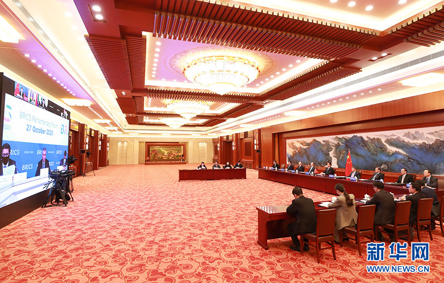10月27日,全國人大常委會委員長栗戰(zhàn)書在北京人民大會堂出席第六屆金磚國家議會論壇視頻會議并發(fā)表講話。 新華社記者 龐興雷 攝