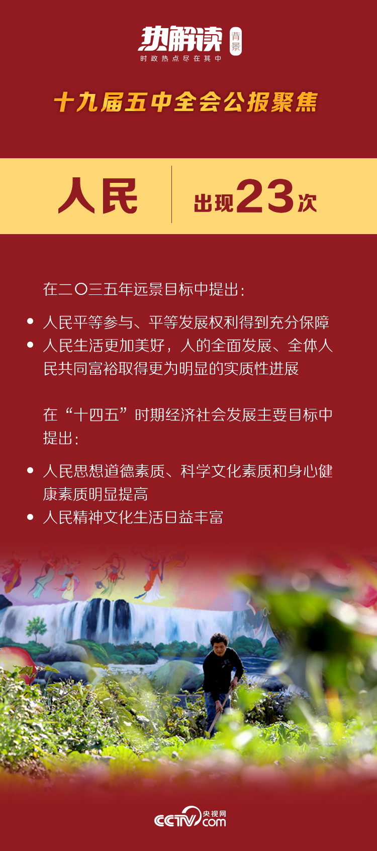 6000多字的公報(bào)中,“人民”一詞出現(xiàn)23次。“人民平等參與、平等發(fā)展權(quán)利得到充分保障”“人民精神文化生活日益豐富”“改善人民生活品質(zhì)”“不斷增強(qiáng)人民群眾獲得感、幸福感、安全感”“提高人民收入水平”“保障人民生命安全”……字字句句,都圍繞著“人民”二字,映射出以習(xí)近平同志為核心的黨中央,率領(lǐng)9000多萬名中國共產(chǎn)黨員為人民謀幸福、為民族謀復(fù)興的奮斗圖景。