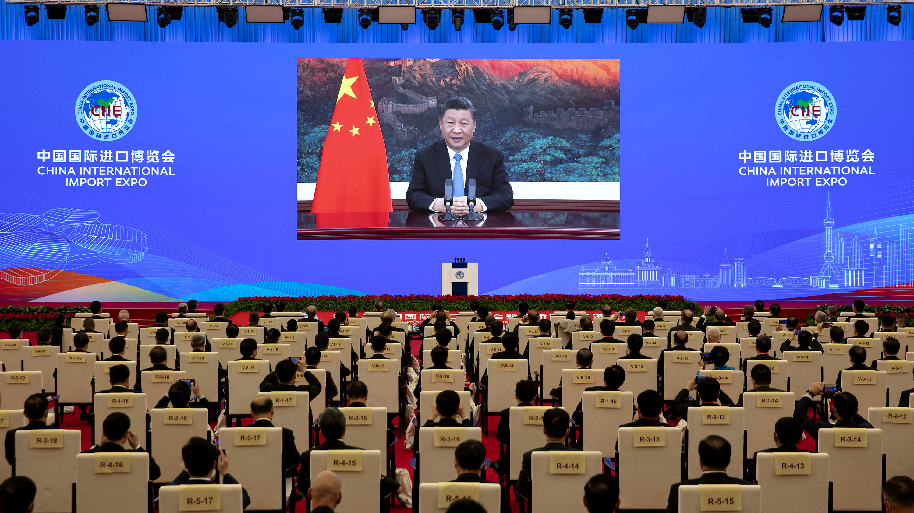 11月4日晚,習(xí)近平在第三屆中國國際進(jìn)口博覽會(huì)開幕式上以視頻方式發(fā)表主旨演講。新華社記者 黃敬文 攝