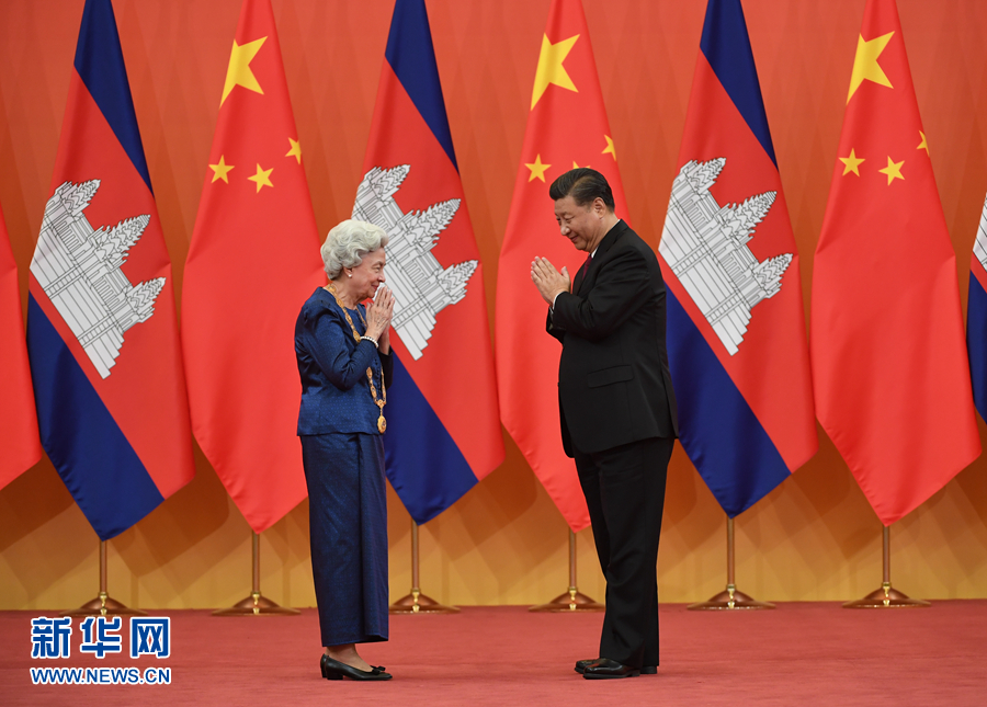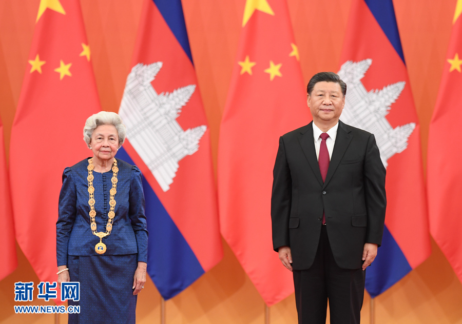 11月6日,國家主席習近平在北京人民大會堂為柬埔寨太后莫尼列舉行中華人民共和國“友誼勛章”頒授儀式。 新華社記者 申宏 攝