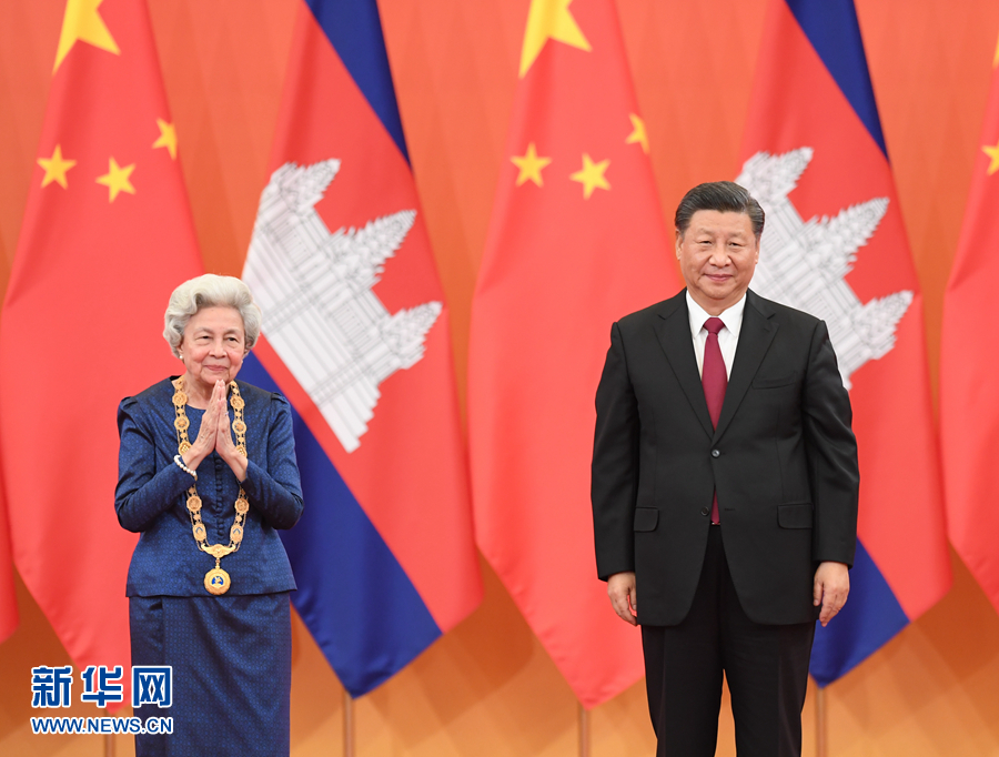 11月6日,國家主席習近平在北京人民大會堂為柬埔寨太后莫尼列舉行中華人民共和國“友誼勛章”頒授儀式。 新華社記者 張領 攝