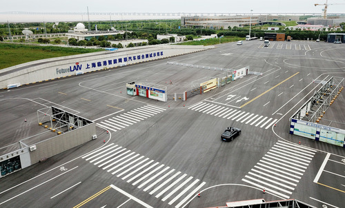 測(cè)試車輛在上海浦東新區(qū)臨港智能網(wǎng)聯(lián)汽車綜合測(cè)試示范區(qū)內(nèi)進(jìn)行行駛測(cè)試(7月3日攝,無人機(jī)照片)。新華社記者 方喆 攝