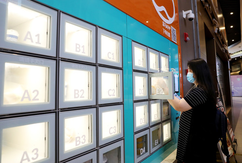 一位顧客通過APP掃碼,在上海地鐵13號(hào)線世博會(huì)博物館地鐵站附近的一家盒小馬服務(wù)點(diǎn)取餐柜中拿取預(yù)定的早餐(7月17日攝)。新華社記者 方喆 攝