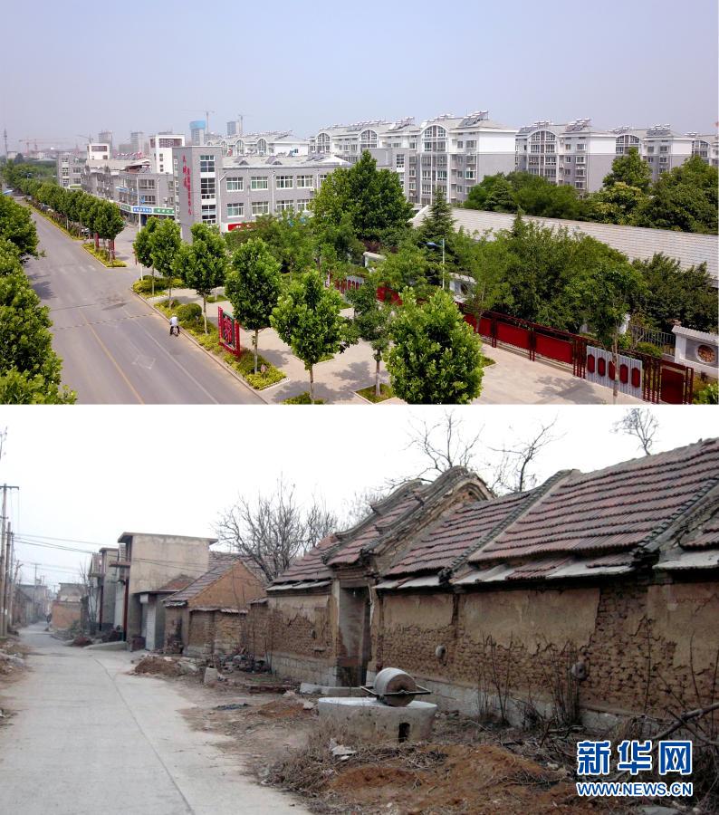 這是一張拼版照片。上圖為濟(jì)南市章丘區(qū)三澗溪村新貌(新華社記者郭緒雷6月10日攝,無(wú)人機(jī)照片);下圖為三澗溪村舊貌(資料照片)。新華社發(fā)