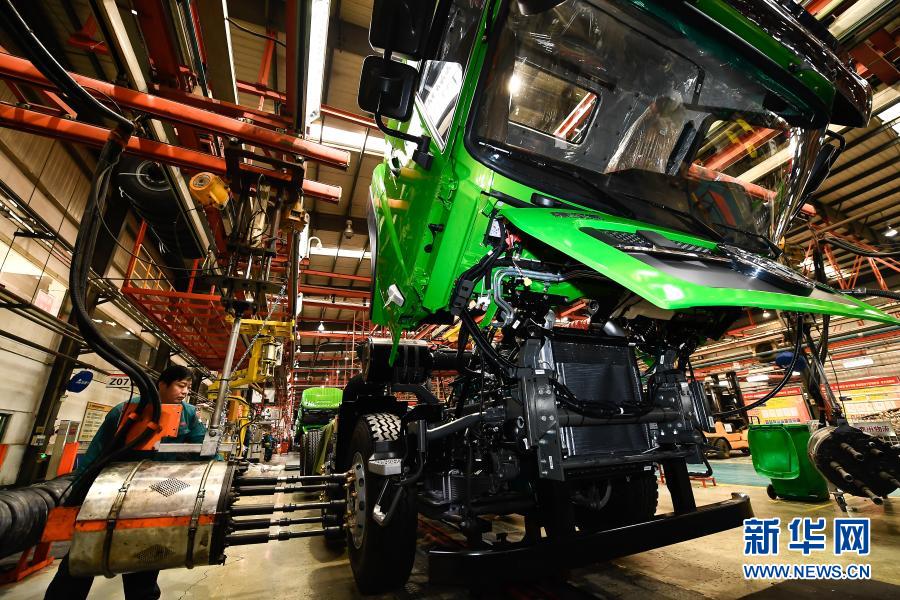 工人在位于濟(jì)南市章丘區(qū)的中國(guó)重汽集團(tuán)濟(jì)南商用車有限公司整車裝配生產(chǎn)線上作業(yè)(2018年1月25日攝)。新華社記者 郭緒雷 攝
