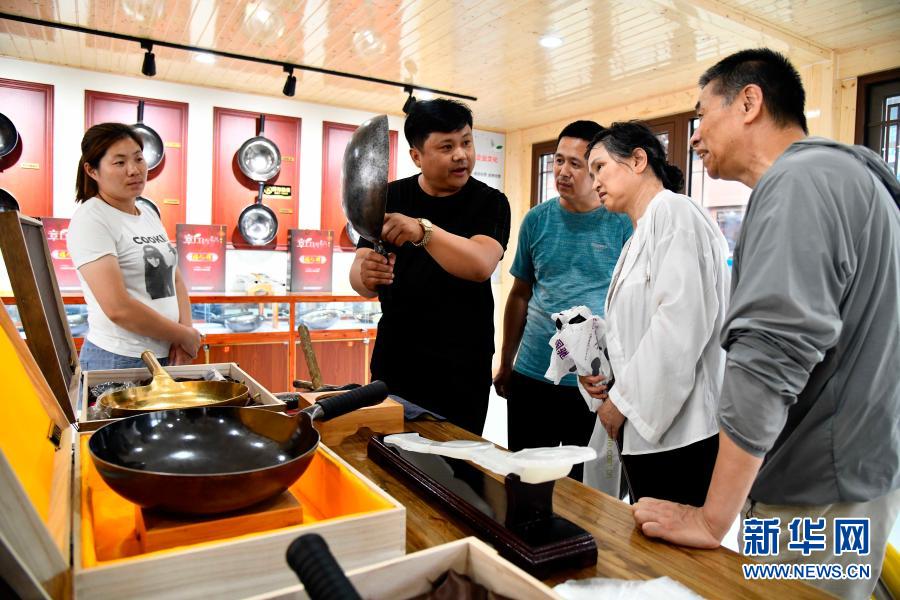 在濟(jì)南市章丘區(qū)三澗溪村美食街,游客在購(gòu)買章丘鐵鍋(6月23日攝)。新華社記者 郭緒雷 攝