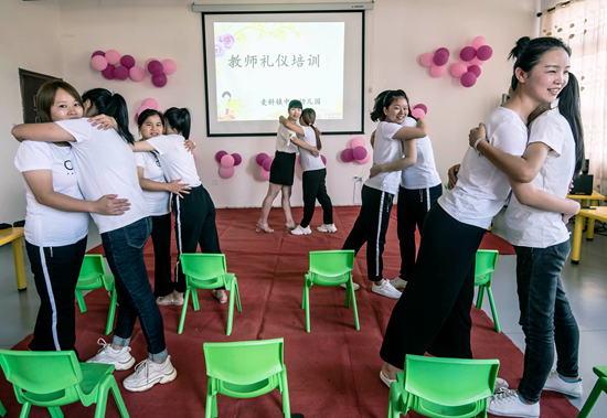 9月9日,江西省吉安市新干縣麥鎮(zhèn)中心幼兒園支教老師鄒小琳(左五)正在對該園幼教老師進行禮儀培訓。視覺中國供圖