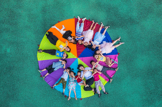 9月9日,江西省吉安市新干縣城上鄉(xiāng)中心幼兒園支教幼師敖敏慧(黃衣服)和劉智秀(白衣服)正在指導該園幼兒開展降落傘游戲。視覺中國供圖