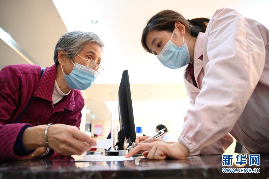 福建省三明市第一醫(yī)院的醫(yī)保辦工作人員(右)向前來咨詢藥品報銷問題的居民講解相關(guān)政策(11月18日攝)。新華社記者 姜克紅 攝