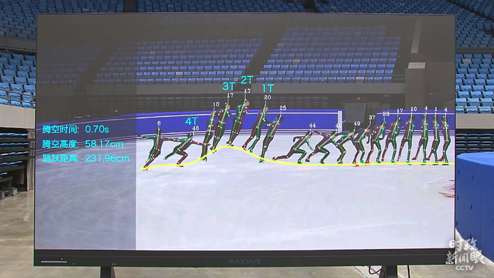 △花樣滑冰隊借助回看實時錄像方式,了解隊員騰空時間、高度和跳躍距離,提高備戰(zhàn)效果。(總臺央視記者鐘銳拍攝)