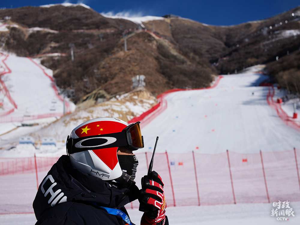 △延慶賽區(qū)高山滑雪中心,為完成賽道造雪任務,山地運行團隊前后投入150余臺造雪機,27臺壓雪車24小時不間斷作業(yè)。這是山地運行負責人吳高勝在指揮工作。(總臺央視記者王哈男拍攝)