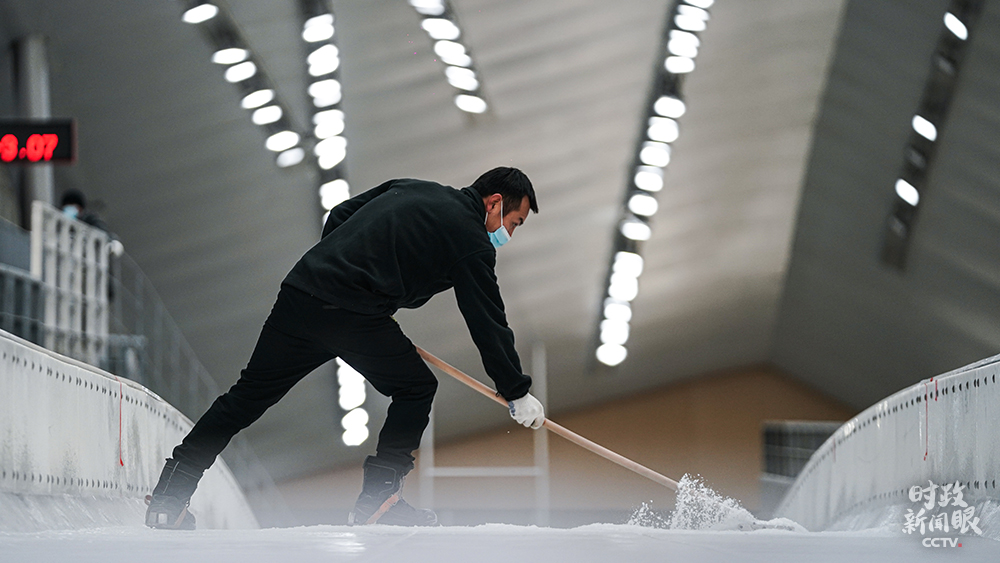 △國家雪車雪橇中心,制冰師對賽道冰面做精細修整。(總臺國廣記者李晉拍攝)