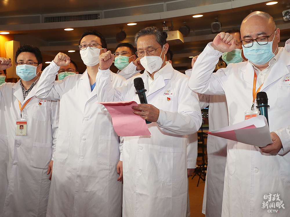△2020年3月2日,廣州醫(yī)科大學(xué)附屬第一醫(yī)院,鐘南山院士(右二)在首批戰(zhàn)“疫”一線火線發(fā)展黨員的入黨宣誓儀式上領(lǐng)誓。