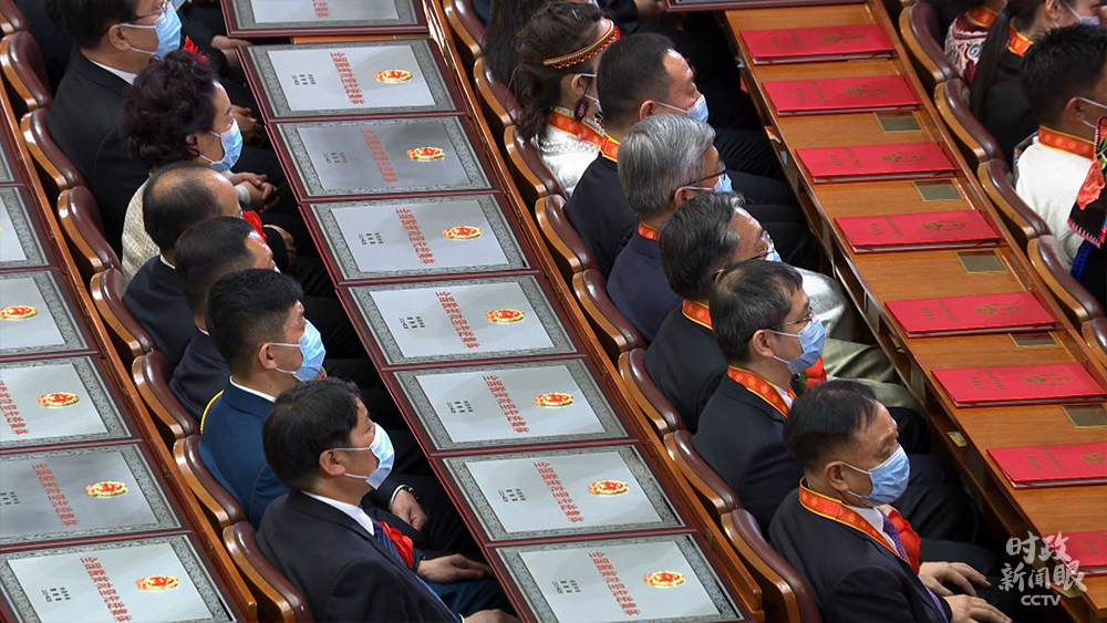 △大會(huì)當(dāng)天,“全國脫貧攻堅(jiān)楷模”榮譽(yù)稱號(hào)獲獎(jiǎng)?wù)叽硎苎谥飨_(tái)就座。(總臺(tái)央視記者鐘鋒拍攝)