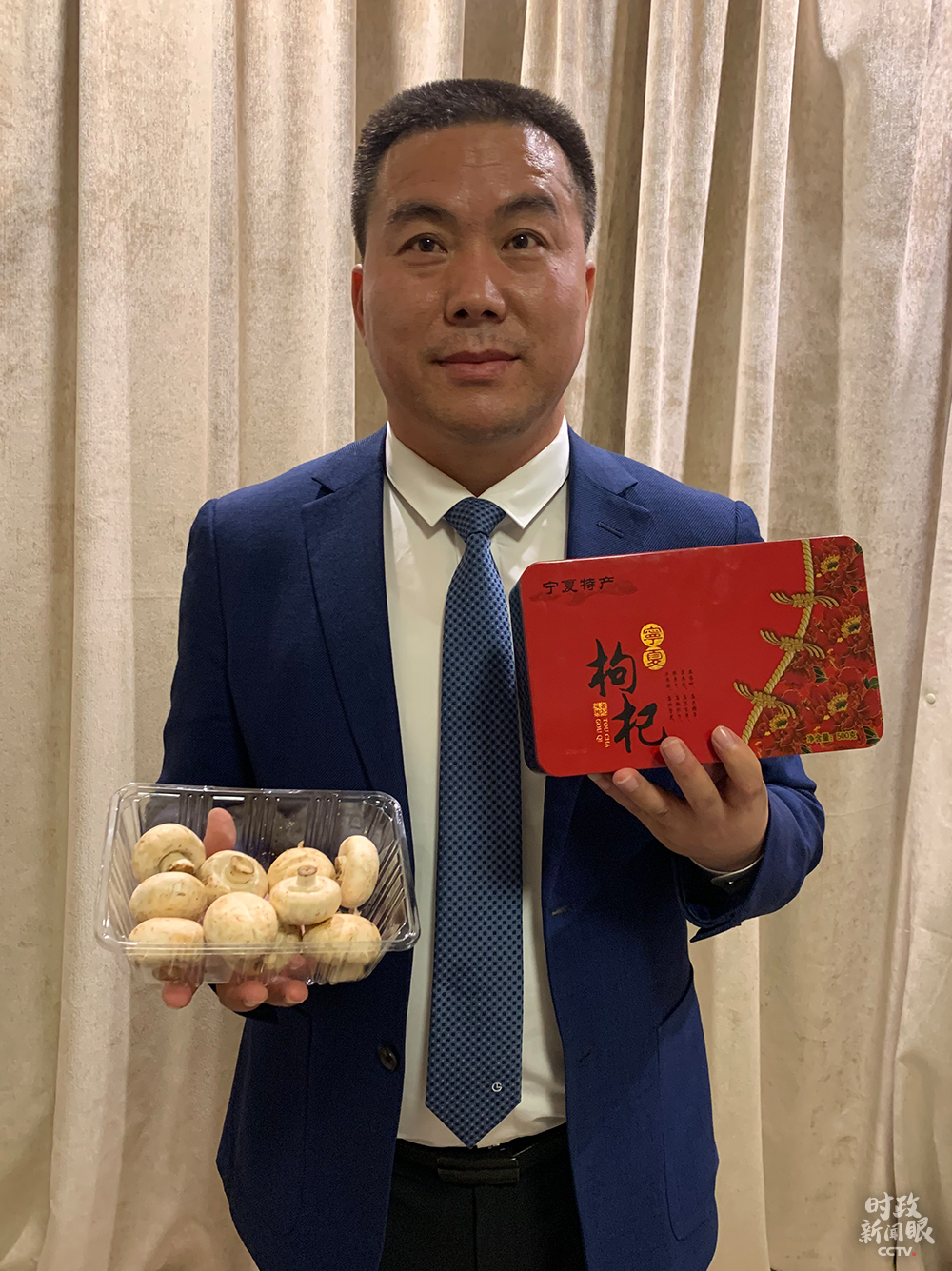 △閩寧鎮(zhèn)黨委書記張文帶來家鄉(xiāng)特產(chǎn)蘑菇、枸杞。(總臺(tái)央視記者范一鳴拍攝)