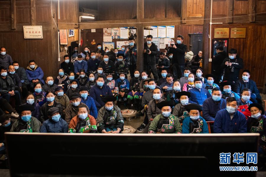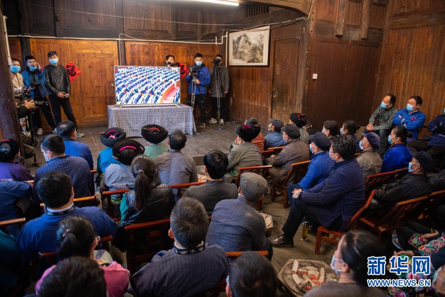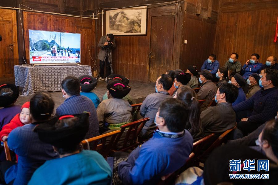 2月25日上午,在湖南省湘西土家族苗族自治州花垣縣十八洞村,當(dāng)?shù)馗刹俊⑷罕娫谝粦舸迕窦沂湛慈珖撠毠?jiān)總結(jié)表彰大會(huì)直播。新華社記者 陳思汗 攝