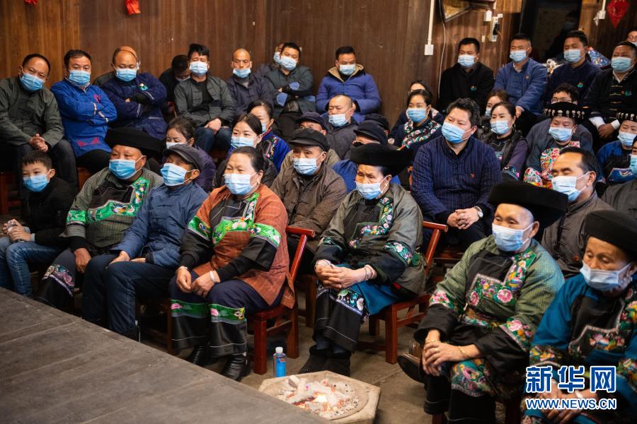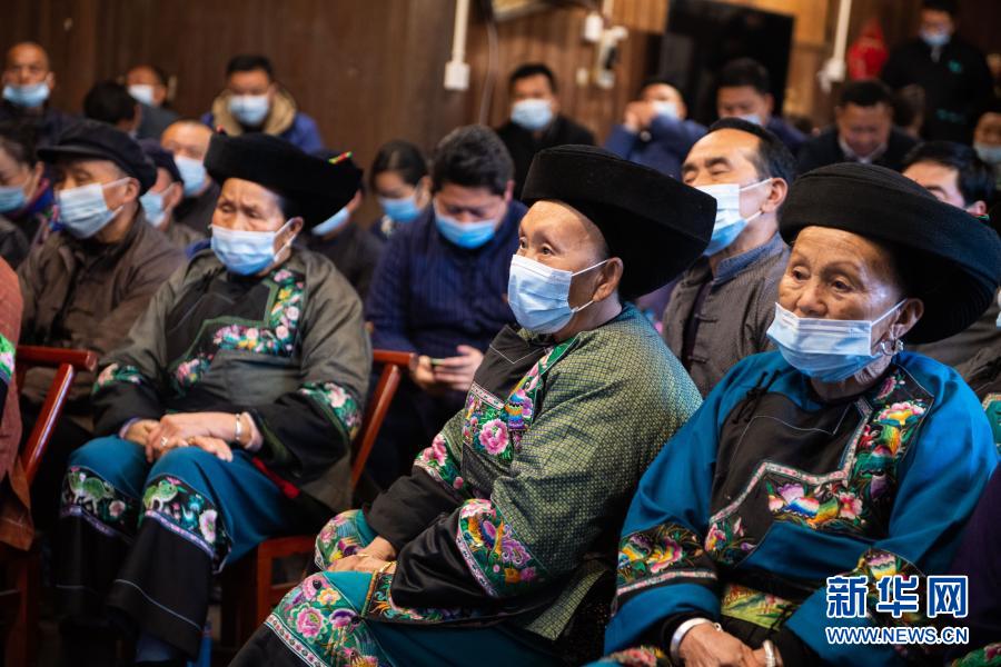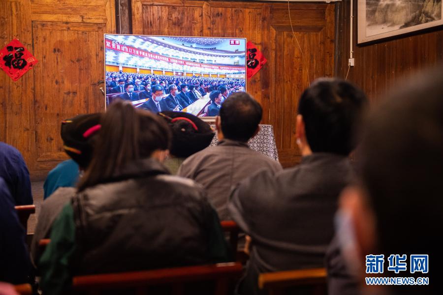 2月25日上午,在湖南省湘西土家族苗族自治州花垣縣十八洞村,當(dāng)?shù)馗刹?、群眾在一戶村民家收看全國脫貧攻?jiān)總結(jié)表彰大會(huì)直播。新華社記者 陳思汗 攝