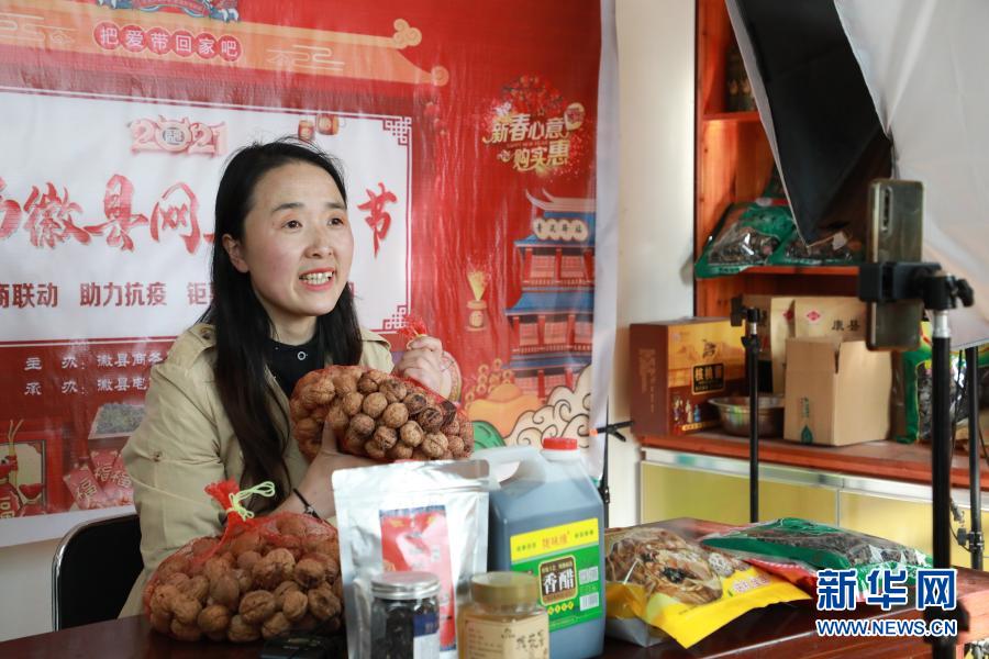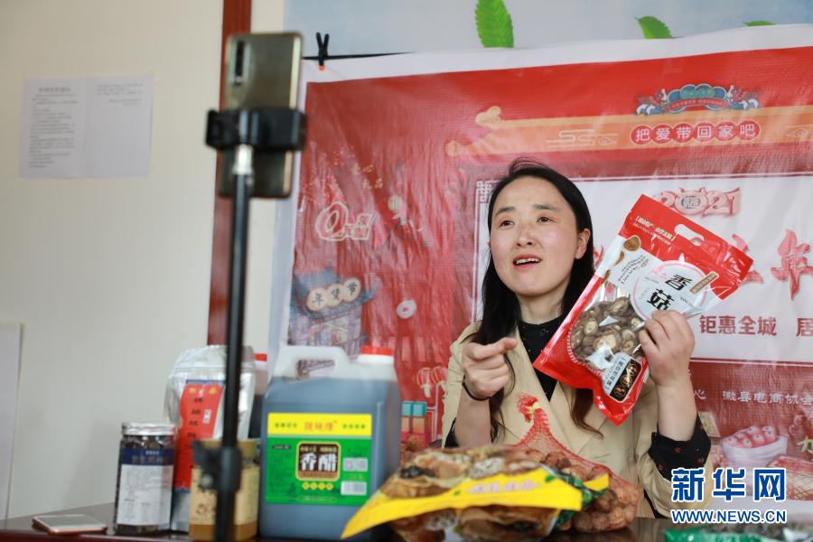 2月23日,在位于甘肅隴南市徽縣的店鋪中,全國人大代表梁倩娟在網(wǎng)上直播銷售當?shù)剞r(nóng)特產(chǎn)品?!⌒氯A社記者 張智敏 攝