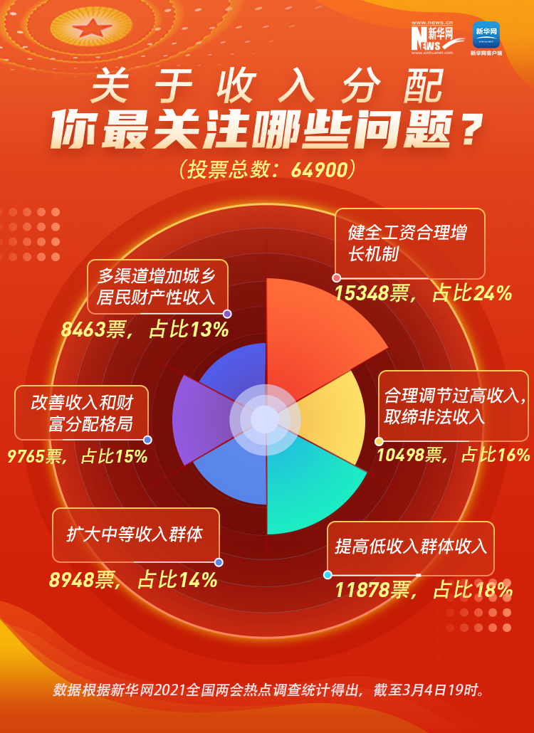 民之所望,政之所向。全國政協(xié)十三屆四次會議3月4日在北京開幕,2021年全國兩會正式開啟。今年你最關(guān)心什么事?在新華網(wǎng)前期推出的2021全國兩會熱點調(diào)查中,收入分配、鄉(xiāng)村振興、“十四五”規(guī)劃、疫情防控、就業(yè)創(chuàng)業(yè)、養(yǎng)老保障等成為網(wǎng)民關(guān)注的熱點話題。