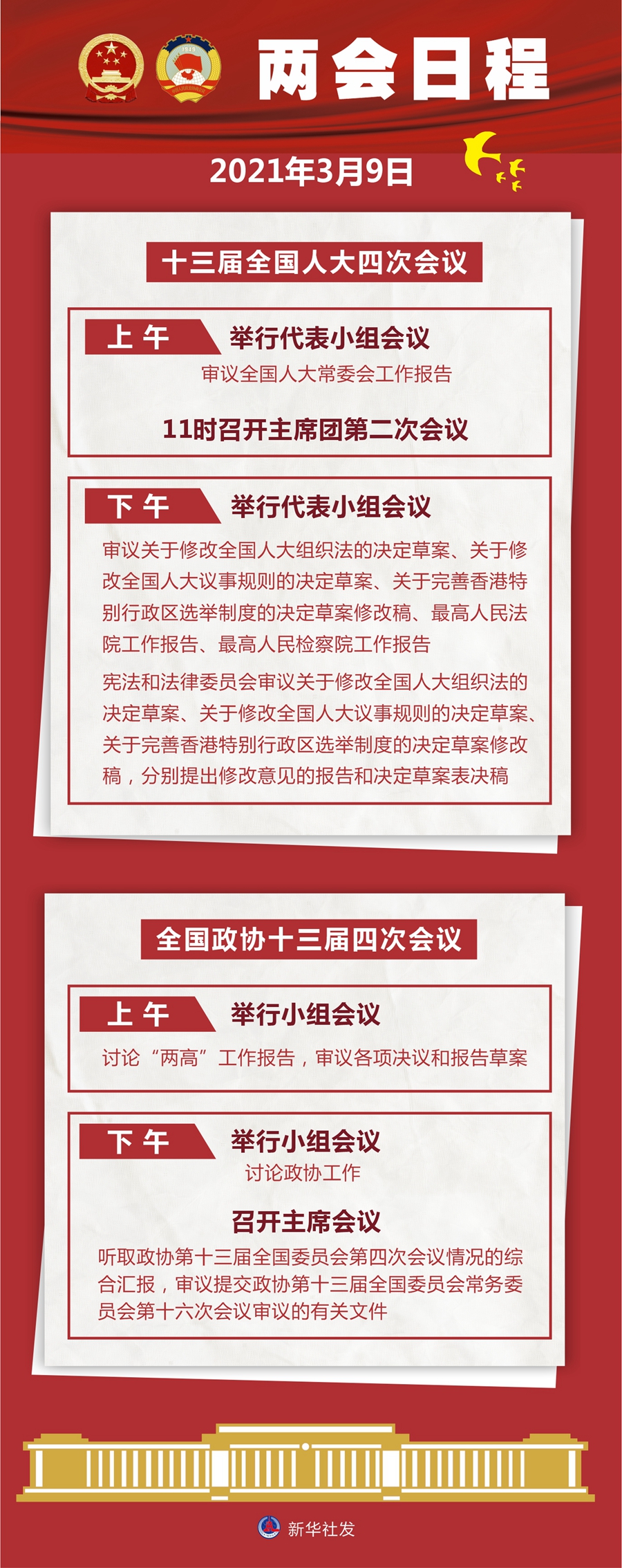 十三屆全國人大四次會議9日上午舉行代表小組會議,審議全國人大常委會工作報告;11時召開主席團第二次會議。下午舉行代表小組會議,審議關于修改全國人大組織法的決定草案、關于修改全國人大議事規(guī)則的決定草案、關于完善香港特別行政區(qū)選舉制度的決定草案修改稿、最高人民法院工作報告、最高人民檢察院工作報告;憲法和法律委員會審議關于修改全國人大組織法的決定草案、關于修改全國人大議事規(guī)則的決定草案、關于完善香港特別行政區(qū)選舉制度的決定草案修改稿,分別提出修改意見的報告和決定草案表決稿。