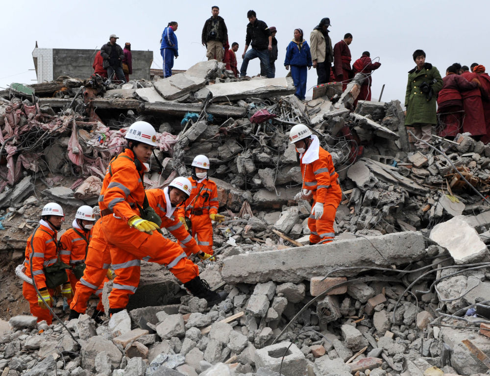 ↓ 圖為2010年4月16日,救援隊員在結(jié)古鎮(zhèn)民族賓館廢墟上進行搜救。