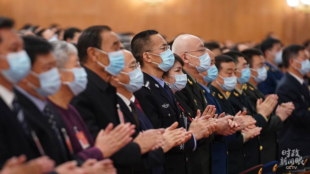 △閉幕會(huì)上,習(xí)近平等黨和國(guó)家領(lǐng)導(dǎo)人步入會(huì)場(chǎng)時(shí),全場(chǎng)起立鼓掌。(總臺(tái)國(guó)廣記者李晉拍攝)