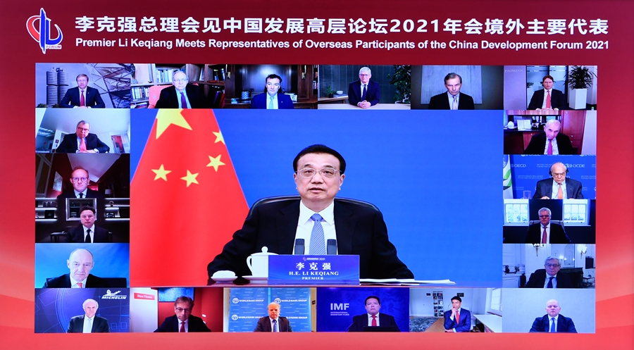 國務院總理李克強3月22日晚在人民大會堂以視頻方式會見出席中國發(fā)展高層論壇2021年年會的境外代表。來自世界五百強企業(yè)的負責人、國際知名學術(shù)研究機構(gòu)的專家學者和主要國際組織代表等參加。
