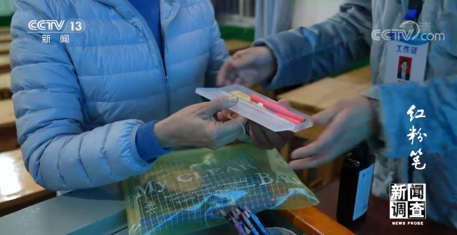 敬一丹再次采訪戚誼老師時,送給她一份只有她倆能懂的特殊禮物:一盒紅粉筆和白粉筆,戚老師頓時淚奔。