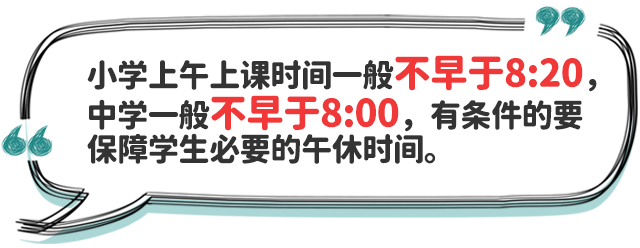 三、統(tǒng)籌安排學(xué)校作息時間。省級教育行政部門要從保證學(xué)生充足睡眠需要出發(fā),結(jié)合實際情況合理確定中小學(xué)作息時間。小學(xué)上午上課時間一般不早于8:20,中學(xué)一般不早于8:00;學(xué)校不得要求學(xué)生提前到校參加統(tǒng)一的教育教學(xué)活動,對于個別因家庭特殊情況提前到校學(xué)生,學(xué)校應(yīng)提前開門、妥善安置;合理安排課間休息和下午上課時間,有條件的地方和學(xué)校應(yīng)保障學(xué)生必要的午休時間;寄宿制學(xué)校要合理安排作息時間,確保學(xué)生達到規(guī)定睡眠時間要求。