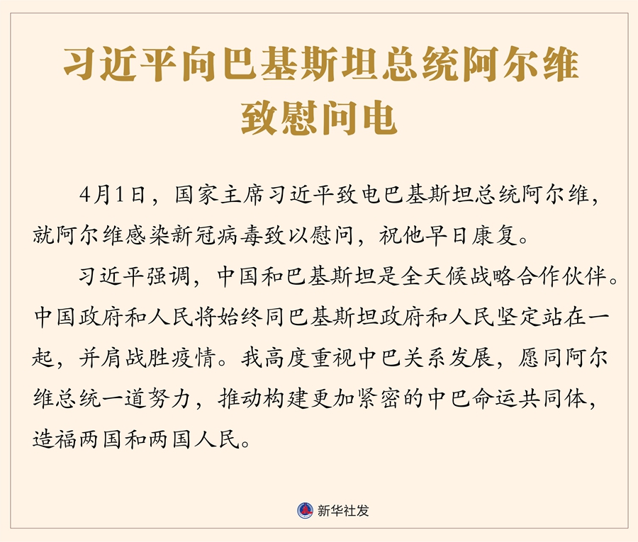 新華社北京4月2日電 4月1日,國(guó)家主席習(xí)近平致電巴基斯坦總統(tǒng)阿爾維,就阿爾維感染新冠病毒致以慰問,祝他早日康復(fù)。