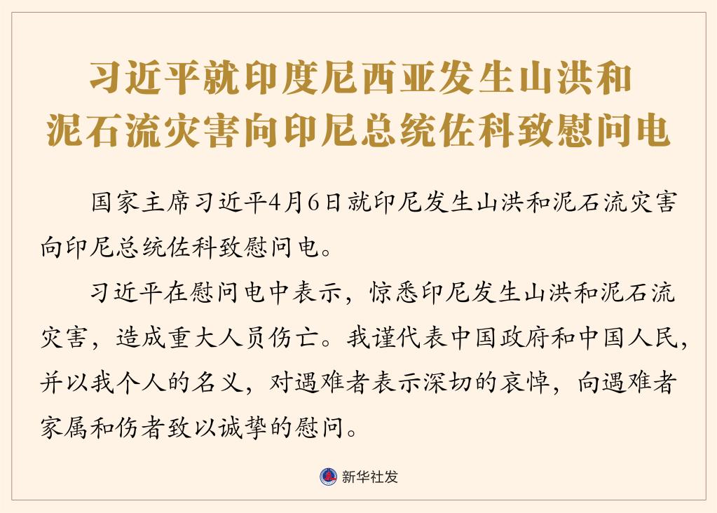 新華社北京4月6日電 國(guó)家主席習(xí)近平4月6日就印尼發(fā)生山洪和泥石流災(zāi)害向印尼總統(tǒng)佐科致慰問電。