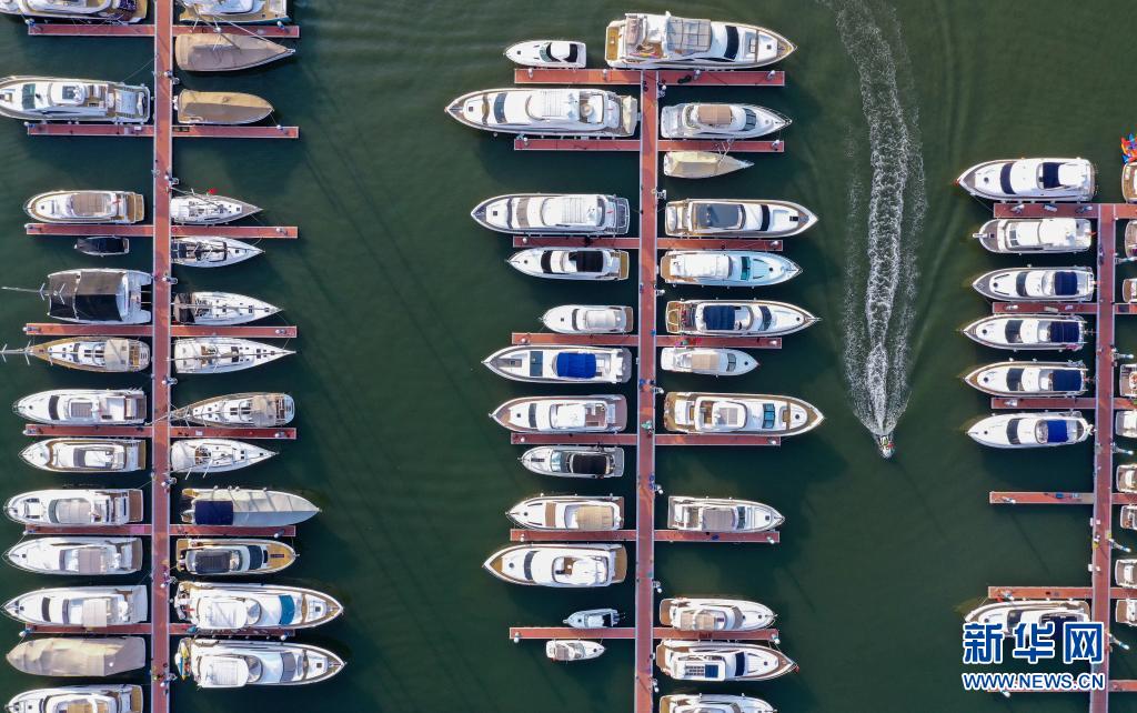 這是在三亞鴻洲國(guó)際游艇會(huì)碼頭停靠的游艇(2020年3月11日攝,無人機(jī)照片)。新華社記者 郭程 攝