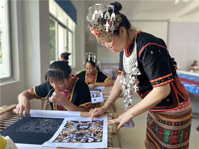在技藝恢復(fù)的過(guò)程中,郭凱的團(tuán)隊(duì)也有意外的收獲。通過(guò)對(duì)三聯(lián)幅、五聯(lián)幅龍被的復(fù)制,恢復(fù)傳統(tǒng)龍被織造技藝,對(duì)黎錦傳統(tǒng)技藝的傳承與發(fā)展具有重要意義;通過(guò)對(duì)龍被的原材料使用和織造技藝(包括紡染織繡各項(xiàng)技藝)過(guò)程編輯形成圖文資料,拍攝形成影像資料,為龍被技藝的保護(hù)、傳承與發(fā)展留下了寶貴的資料和傳播素材;通過(guò)開(kāi)辦龍被刺繡技能培訓(xùn)班,培養(yǎng)了一批刺繡人才,使越來(lái)越多的人群能夠掌握傳統(tǒng)特色一技之長(zhǎng),繼而產(chǎn)生富有民族特色的經(jīng)濟(jì)效益和社會(huì)效益,更大程度地傳承民族技藝,并將其發(fā)揚(yáng)光大。