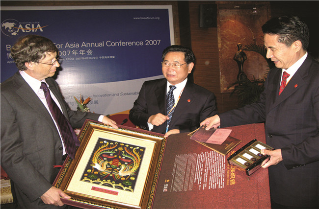 時(shí)任海南省委書(shū)記衛(wèi)留成、省長(zhǎng)羅保銘向微軟公司董事長(zhǎng)比爾.蓋茨贈(zèng)送黎錦禮品