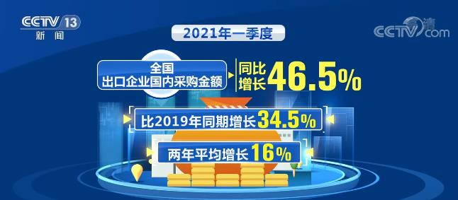 2021年一季度,海外需求復蘇繼續(xù)拉動我國出口快速增長,全國出口企業(yè)國內(nèi)采購金額同比增長46.5%,比2019年同期增長34.5%,兩年平均增長16%,年均增速高于全國平均水平2.9個百分點。