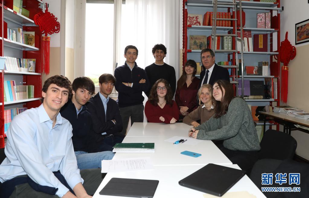 意大利羅馬國(guó)立住讀學(xué)校校長(zhǎng)雷亞萊(后排右一)與致信習(xí)近平主席的學(xué)生們?cè)谝黄穑?019年3月18日攝)。新華社記者 程婷婷 攝