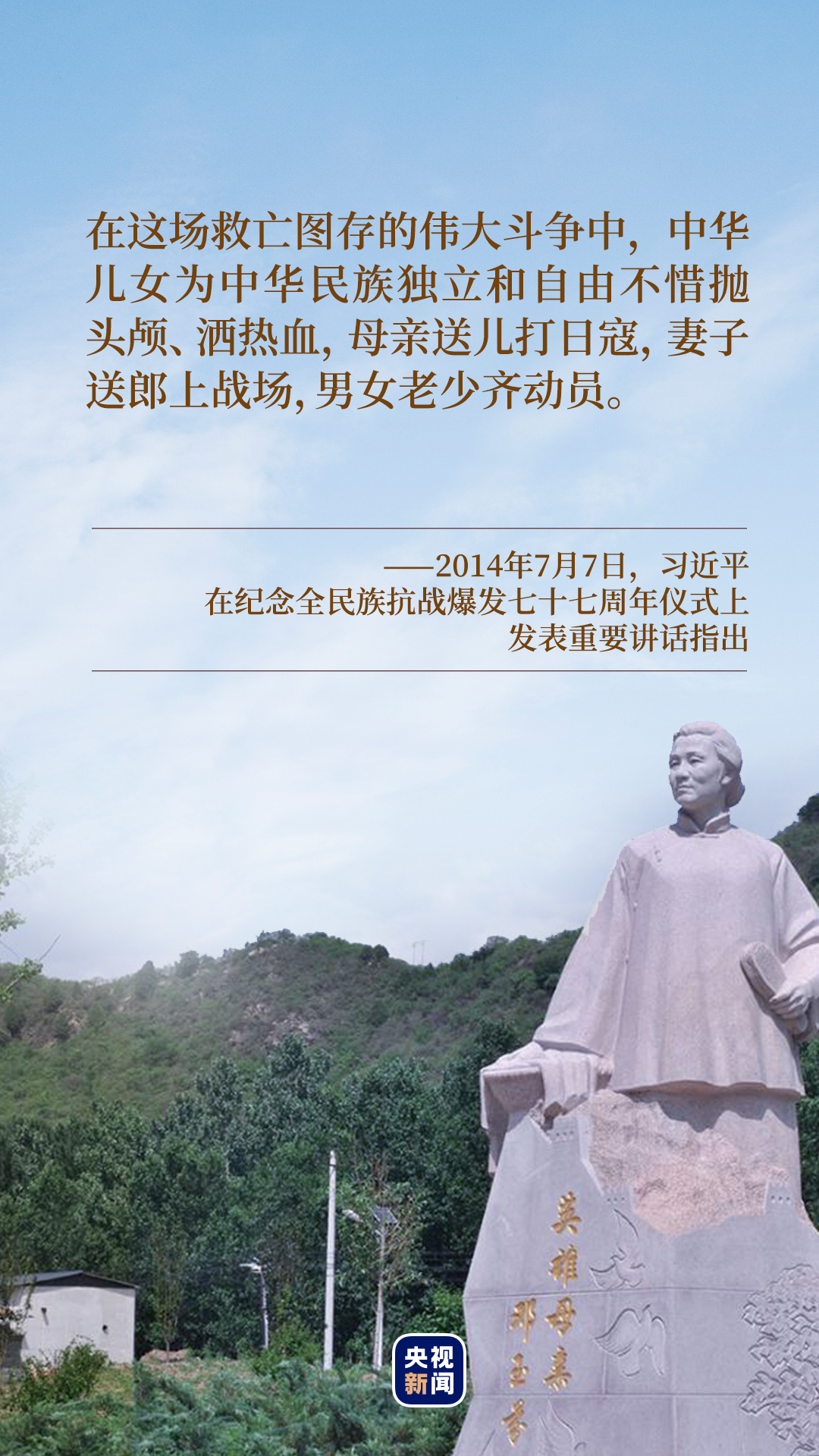 “北京密云縣一位名叫鄧玉芬的母親,把丈夫和5個孩子送上前線,他們?nèi)繎?zhàn)死沙場。”2014年7月7日,在出席紀念全民族抗戰(zhàn)爆發(fā)七十七周年儀式并發(fā)表重要講話時,習近平總書記講述了英雄母親鄧玉芬的故事。