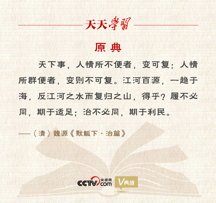 《默觚》是中國近代思想家魏源的哲學著作。魏源從歷史自身的“自變性”去探求歷史發(fā)展的驅動力,認為歷史變化發(fā)展的標準是“便民”。為此,他用生動的比喻加以說明:“履不必同,期于適足;治不必同,期于利民。”意思是說,每一個人的鞋子大小不必相同,關鍵是要適合自己的腳;每個國家的治理方法不必雷同,關鍵是要有利于人民。