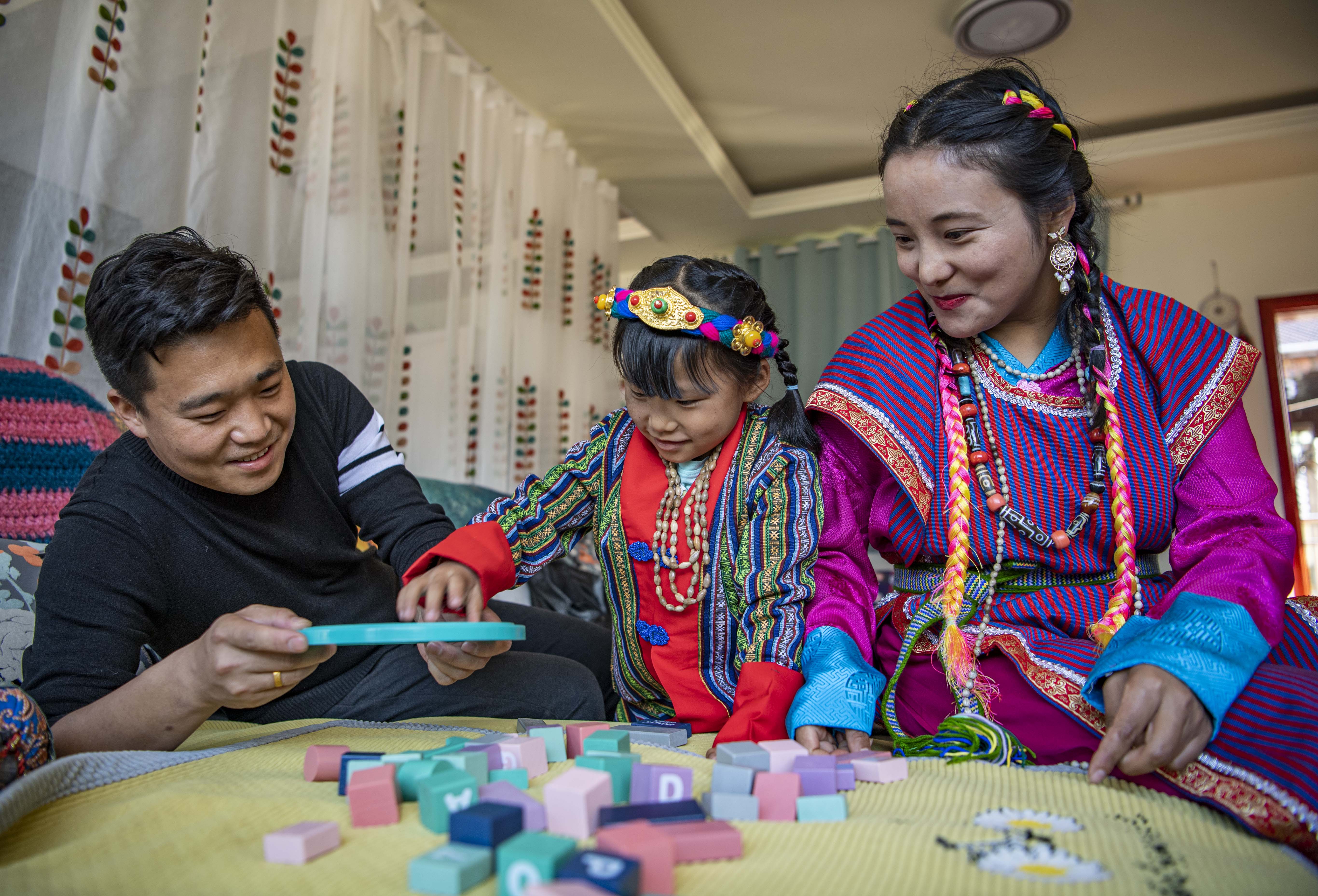 ↑2021年2月11日,在位于西藏林芝市墨脫縣的家中,山西小伙張淳煥和門(mén)巴族妻子扎西玉珍陪女兒玩積木。