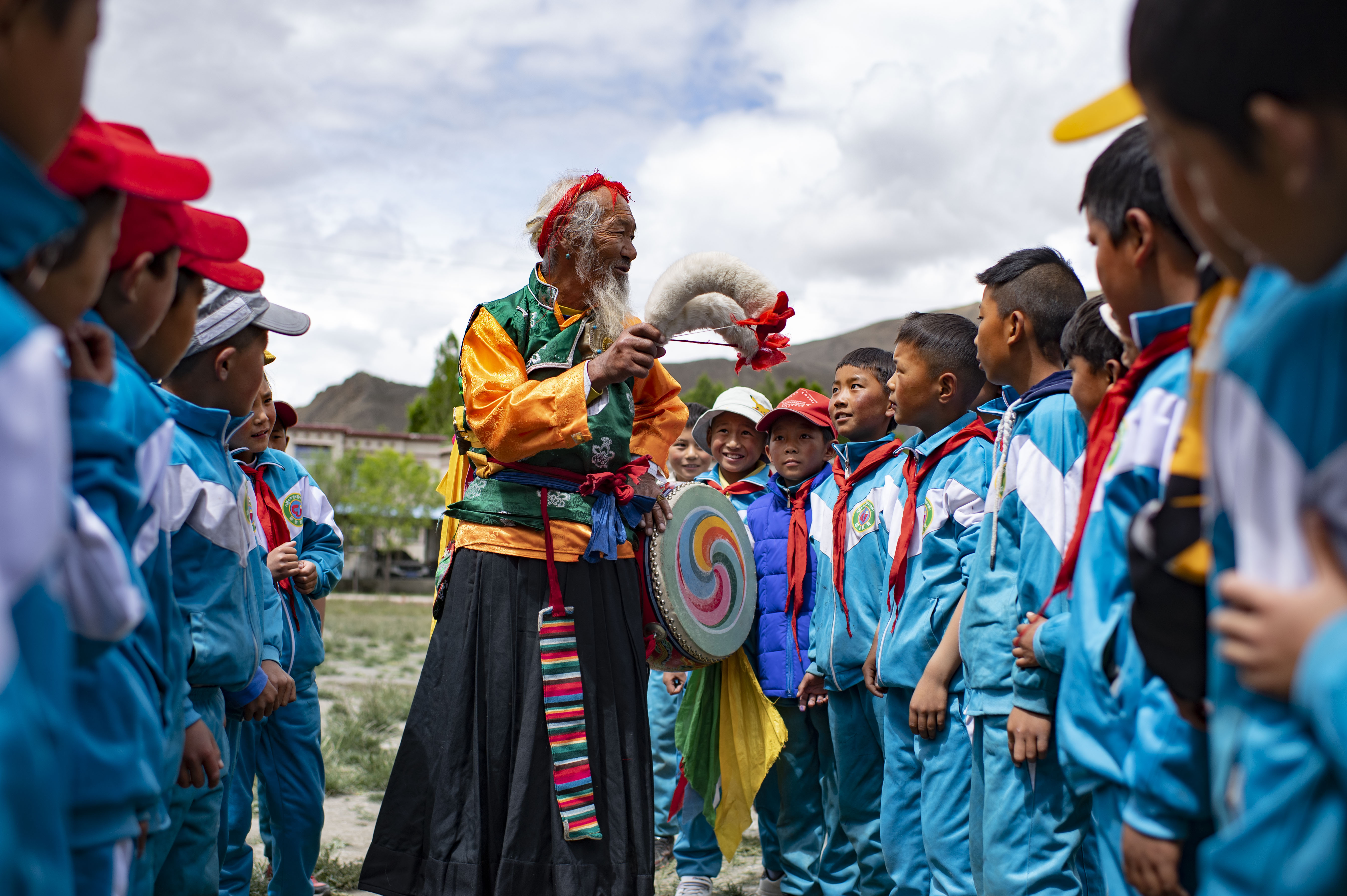 ↑2020年7月2日,國(guó)家級(jí)非物質(zhì)文化遺產(chǎn)項(xiàng)目“久河卓舞”傳承人尼瑪在西藏山南市瓊結(jié)縣下水鄉(xiāng)小學(xué)進(jìn)行教學(xué)表演。