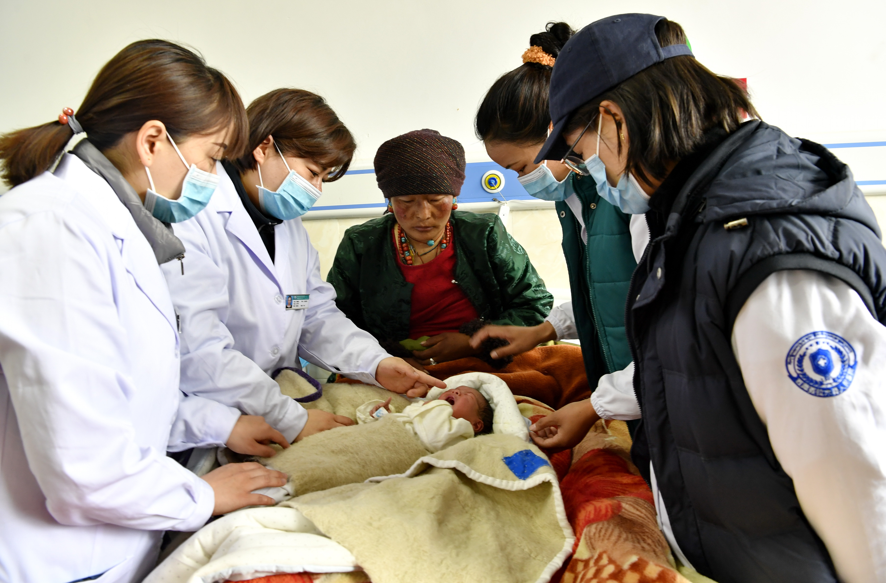 ↑2021年4月21日,在西藏聶拉木縣人民醫(yī)院,山東省煙臺(tái)市第五批援藏醫(yī)療隊(duì)隊(duì)長(zhǎng)魏德賢(左二)、護(hù)士長(zhǎng)崔雯(左一)和當(dāng)?shù)蒯t(yī)院婦產(chǎn)科主任邊巴普尺(右二)、婦產(chǎn)科醫(yī)生扎桑德吉(右一)查房。