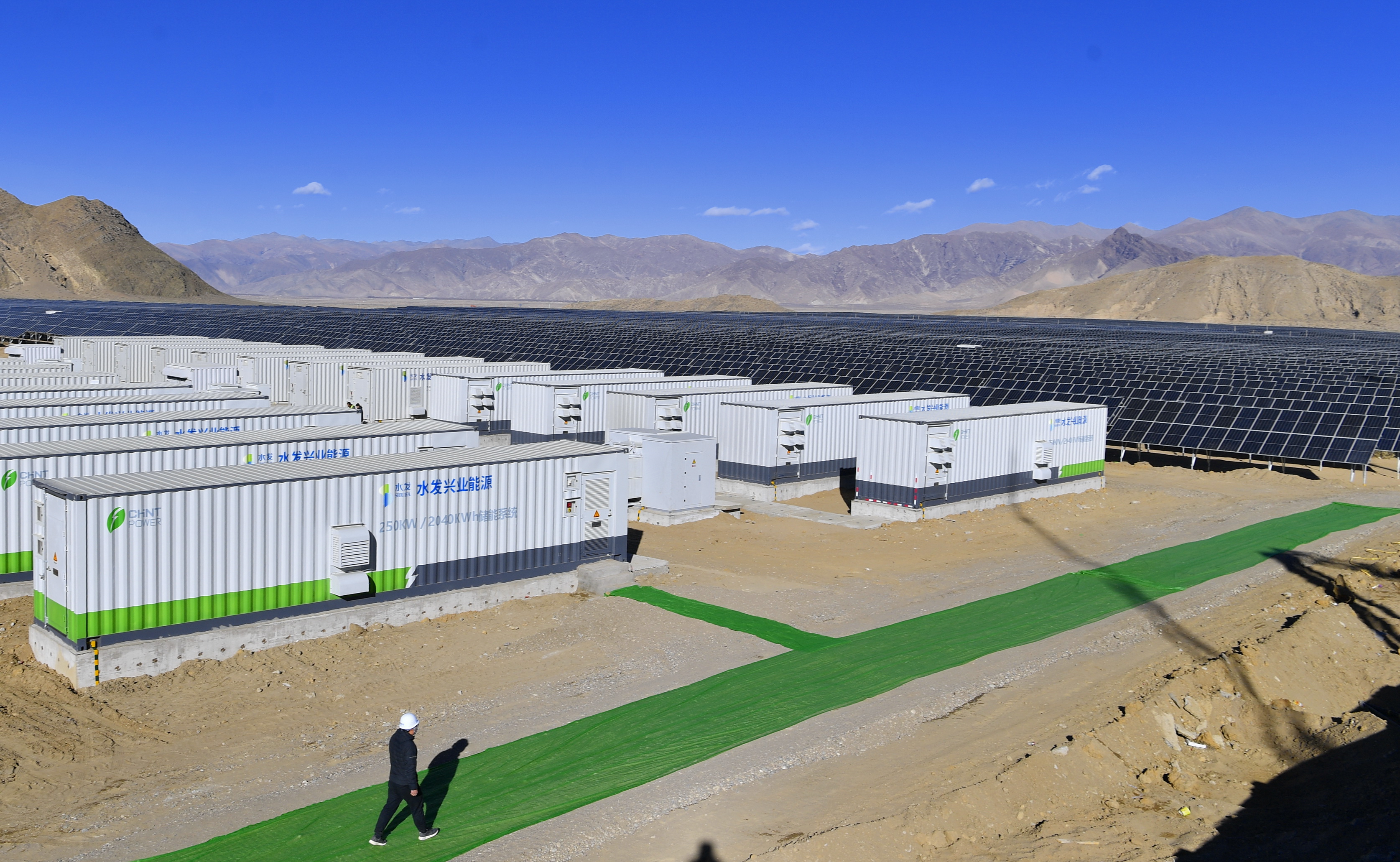 ↑2020年12月24日拍攝的日喀則市江當(dāng)現(xiàn)代生態(tài)產(chǎn)業(yè)示范園內(nèi)的50兆瓦光儲(chǔ)電站儲(chǔ)能系統(tǒng)和太陽(yáng)能光伏組件。